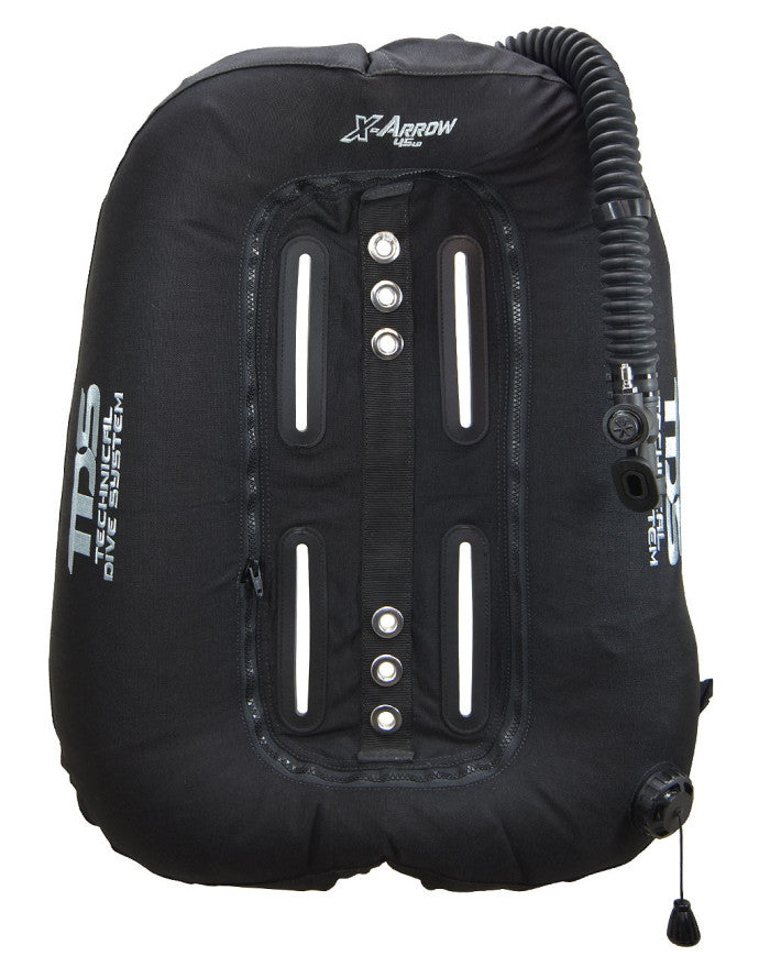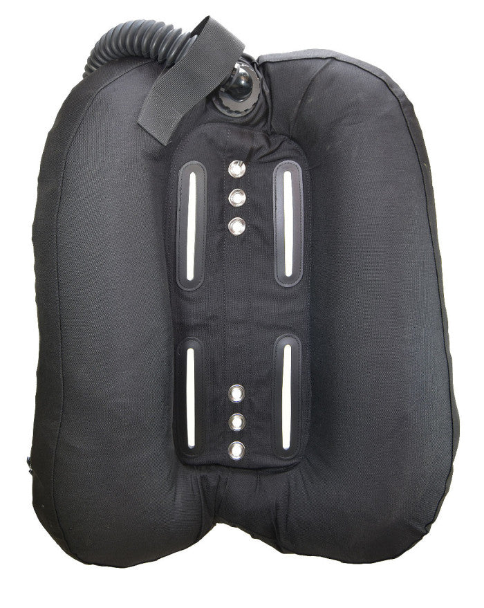 45 lb (about 20 liters) single bottle wing, in circular “donut” format for fast air distribution. With an external cordura of 1000 dn, it includes a single-bottle adapter plate attached by adjustment screws to the backplate and two cinch straps for bottle adjustment.